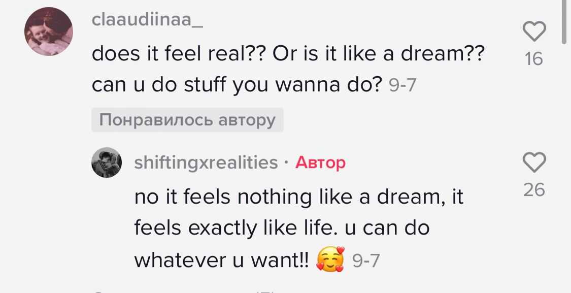 Некоторым пользователям платформы, по их словам, уже удалось погостить в параллельном мире. Например, девушка Хелен поделилась с изданием Vice своим опытом пребывания в желаемой реальности. По её заверениям, полученные в ходе шифтинга переживания сильно отличаются от сновидения и во многих аспектах напоминают реальность.