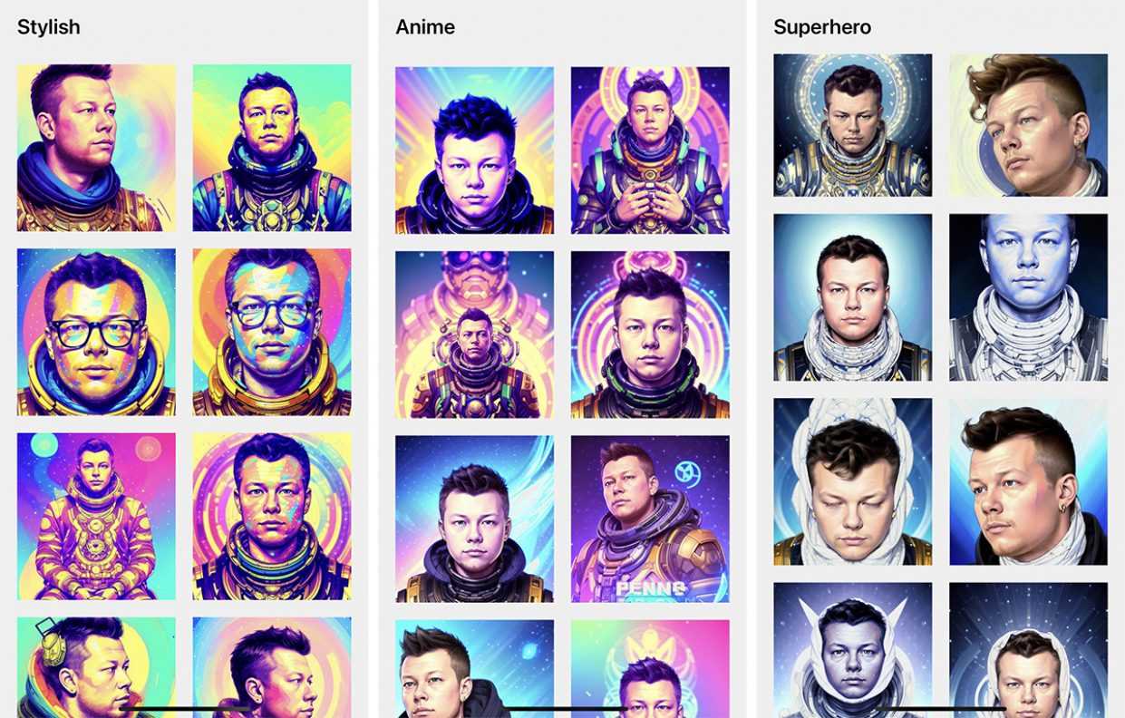 Вот несколько примеров того, что может сделать нейросеть Lensa. Она создает портреты в разных стилях — может даже сделать из вас космонавта. В общем, если хотите увидеть себя глазами нейросети, это отличный инструмент.