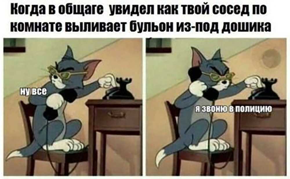 У этого мема сразу два варианта. Том либо оглядывается, а затем с возмущенным лицом звонит кому-то по телефону. Либо открывает дверь двум громилам и указывает им на кого-то пальцем. Применение очевидное — реакция на что-то, что тебе очень не нравится. Либо подшучивание над стукачеством в принципе. Первый вариант одно время был популярен с подписью: «Ну все, я звоню в полицию».