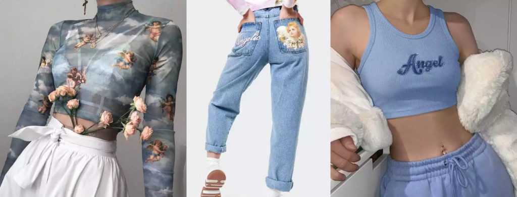 Здесь всё просто. Стилистику течения определяют «ангельские» атрибуты: облака, кружево, бледный розовый и голубой, образы купидонов, розочки, арфы, нимбы (halos) и лучи света, цель которых передать чистоту и невинность образа.