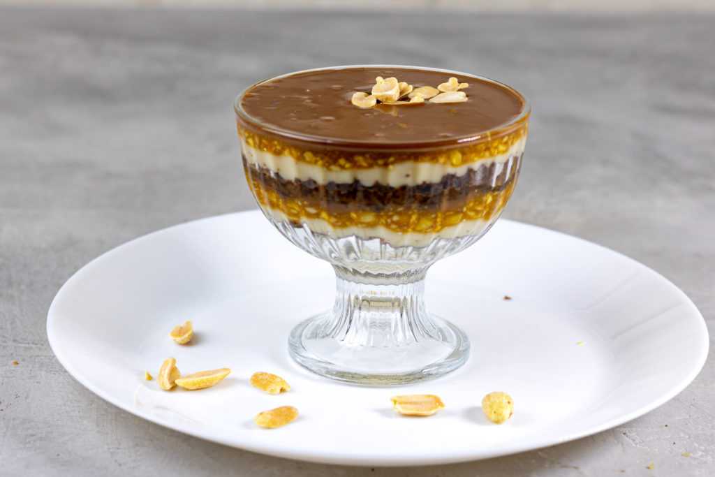 - Чередуя слои крема, бисквита и арахиса в карамели соберите трайфл. Не забудьте оставить немного места для финального слоя из ганаша, который надо достать из холодильника непосредственно перед использованием. Сверху трайфл лучше всего украсить шоколадной крошкой или арахисом.