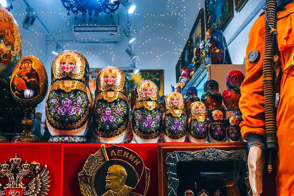 В июле довольно жарко и даже была гроза, но в сувенирных магазинах до сих пор продавали меха. А то, что мы называем babushka, здесь называют matryoshka, вложенные куклы. Они могут быть очень необычными и изящными — отсюда и высокая цена. Но есть и бюджетные варианты.
