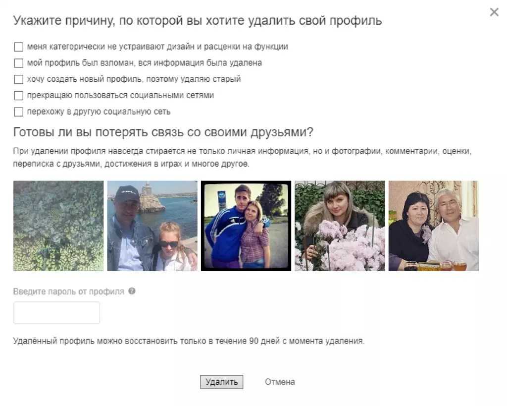 Откроется окно, в котором предлагается выбрать причину, по которой удаляется страничка, и ввести действующий пароль: