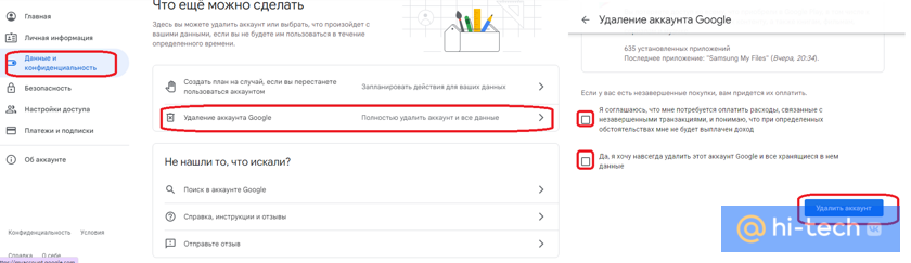 - Пролистайте страницу вниз и выберите пункт “Удаление аккаунта Google — Полностью удалить аккаунт и все данные”.