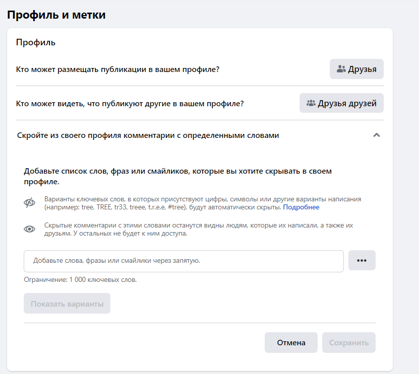 Если раскрыть пункт меню «Скройте из своего профиля комментарии с определенными словами», можно добавить список запрещенных слов — Facebook не пропустит публикации и комментарии, которые их содержат.