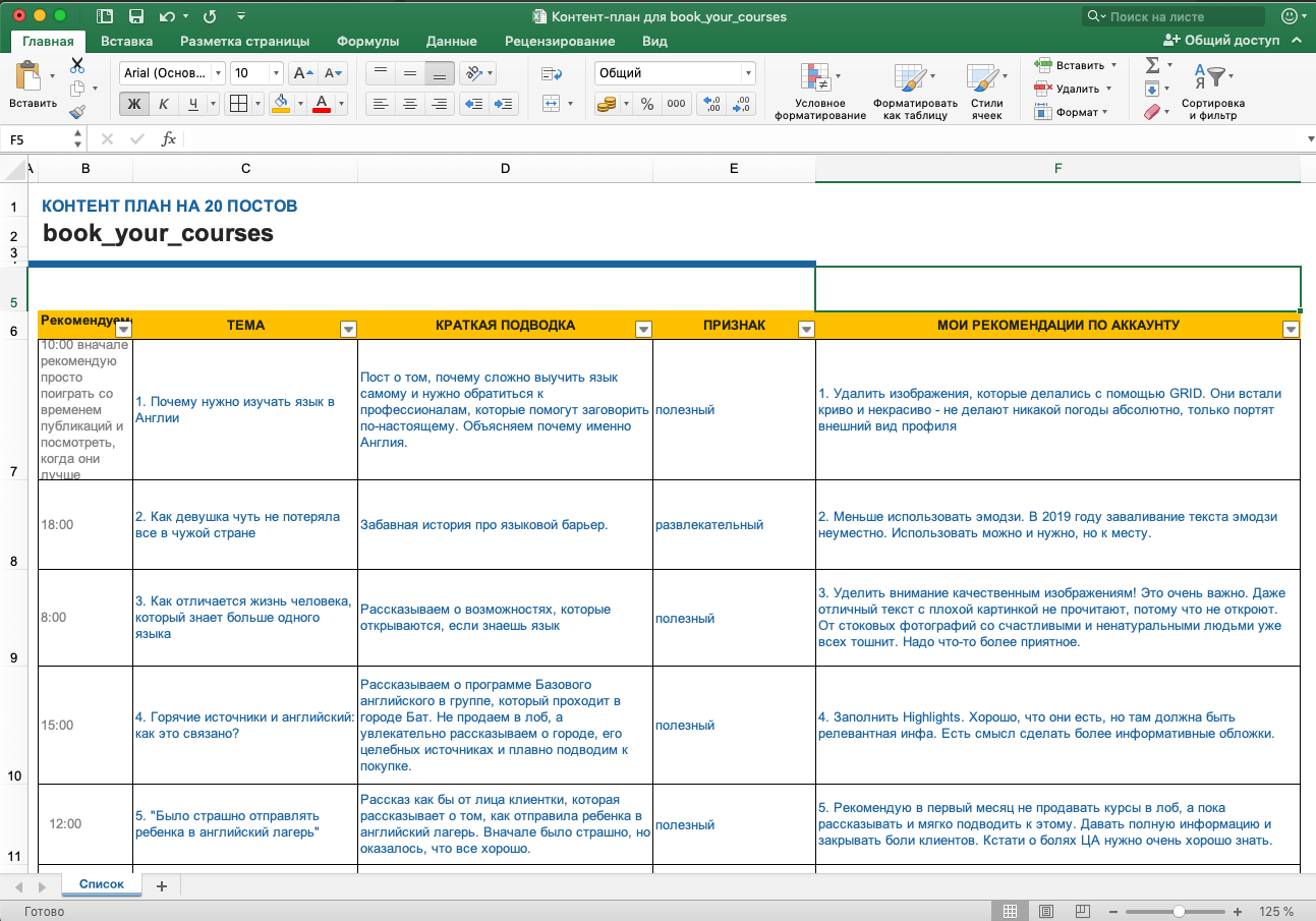 Пример контент-плана, который я делала для профиля курсов по английскому языку. Вы можете видеть, что я сделала разбор и посоветовала исправить ошибки, которые были допущены при оформлении. А также вписала рекомендуемое время публикации и признак поста
