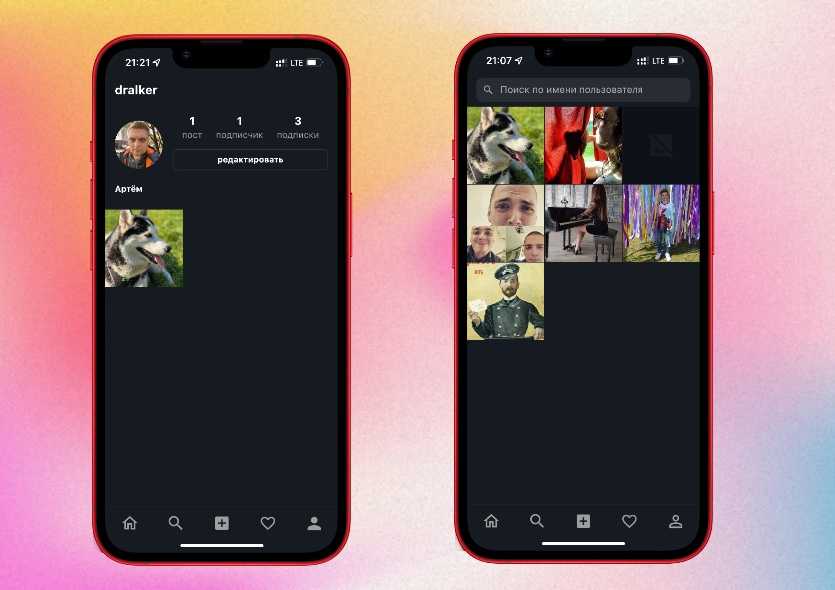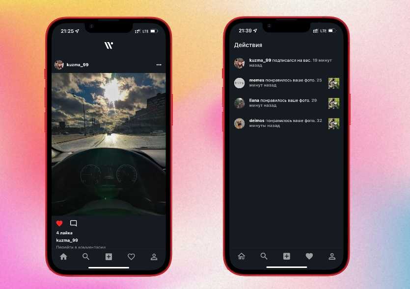 В меню с общими публикациями показываются посты других пользователей в одной общей ленте. Во вкладке «действия» отображаются поставленные вам лайки и действия других людей, вроде подписки на ваш профиль. На все действия с вашим или чужим профилем есть push-уведомления.