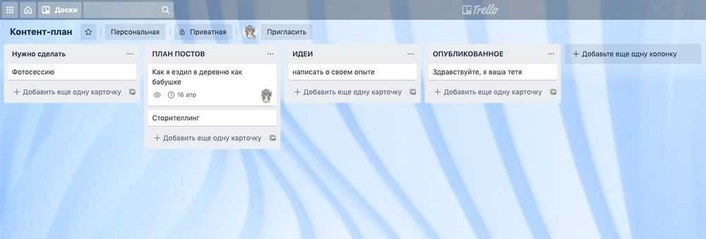 Если вариант с таблицами для вас слишком консервативен и хочется более креативного подхода – попробуйте Trello. В сервисе гораздо удобнее сохранять идеи, писать развернутые посты и прикреплять файлы. Вы можете выставлять сроки на карточках, переносить их из одной колонки в другую. Фактически в одном сервисе вы получаете не только табличку с темами, но и полноценный инструмент для хранения созданных постов с текстами, прописанными хештегами и фотографиями.