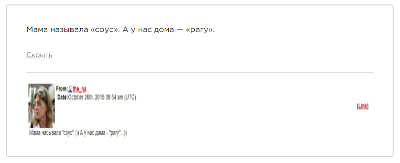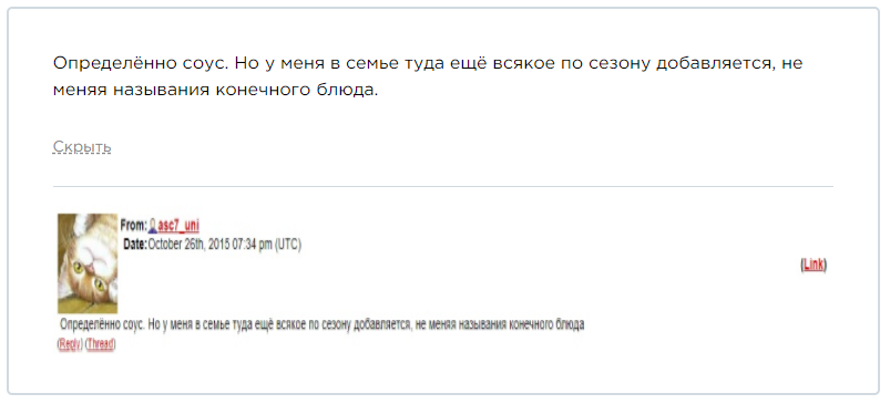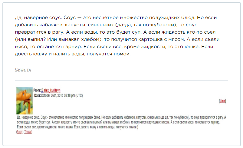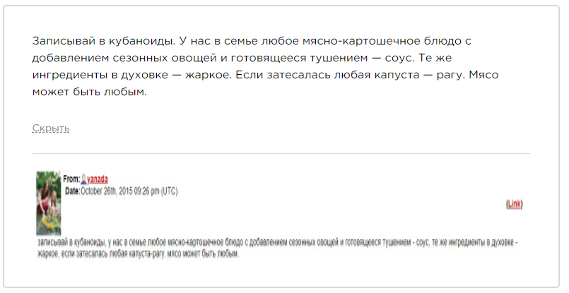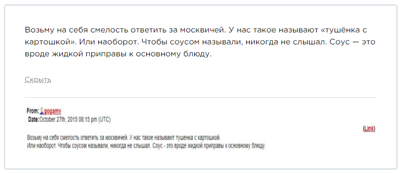 Оказалось, что такое простое блюдо может стать предметом серьёзной дискуссии, когда дело доходит до того, как именовать содержимое тарелки. Свой вариант предложили жители Кубани. По мнению южан, такой ужин из картофеля с курицей называется «соус». Тред, посвящённый спорному блюду, ещё несколько лет назад на LiveJournal начал мужчина с Кубани Павел Мудров pnl .