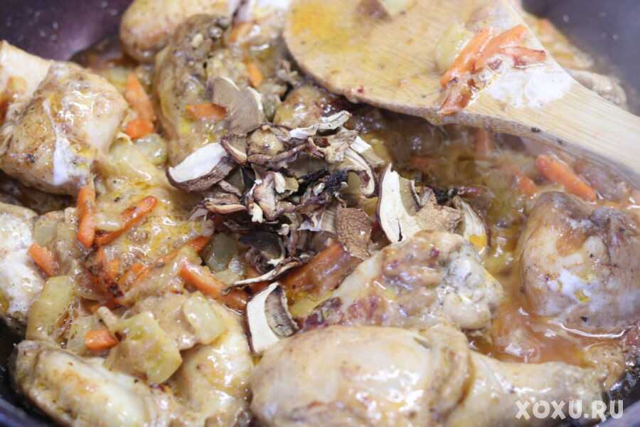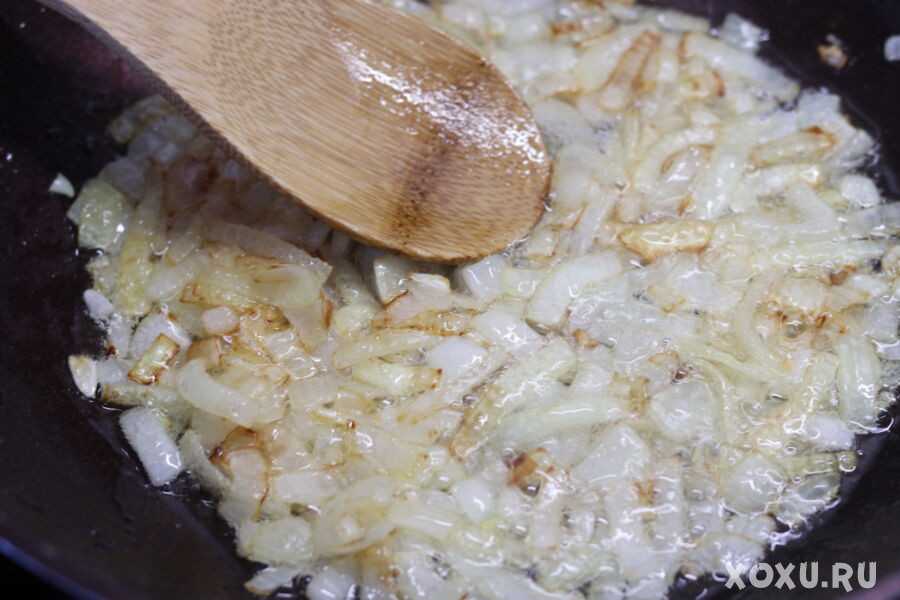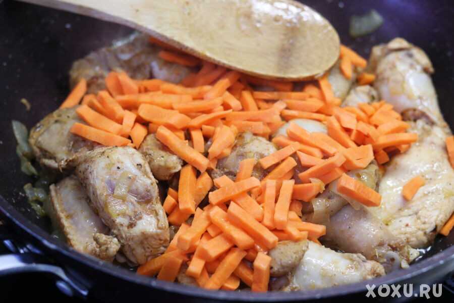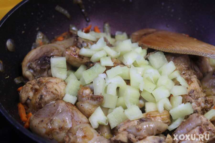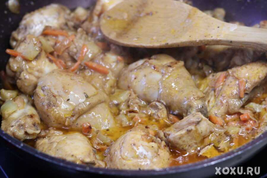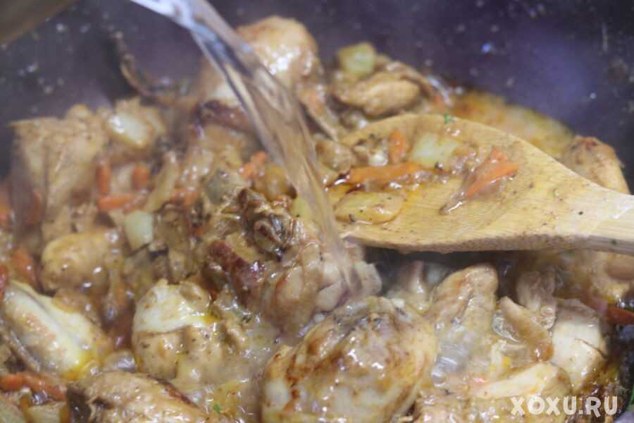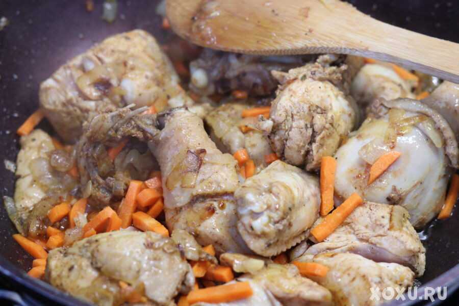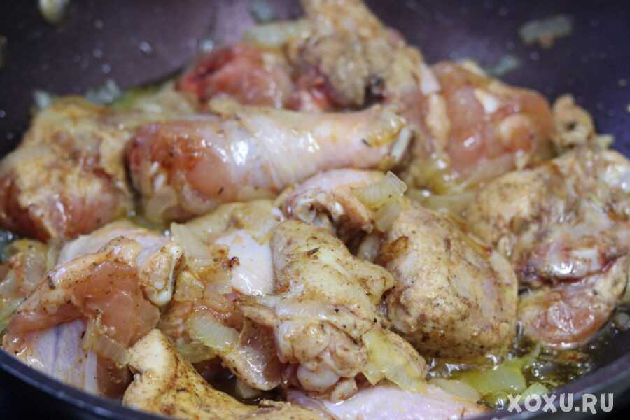 Курицу отправили вторым этапом после лука. И вместе с луком обжариваем её примерно 20 минут…
