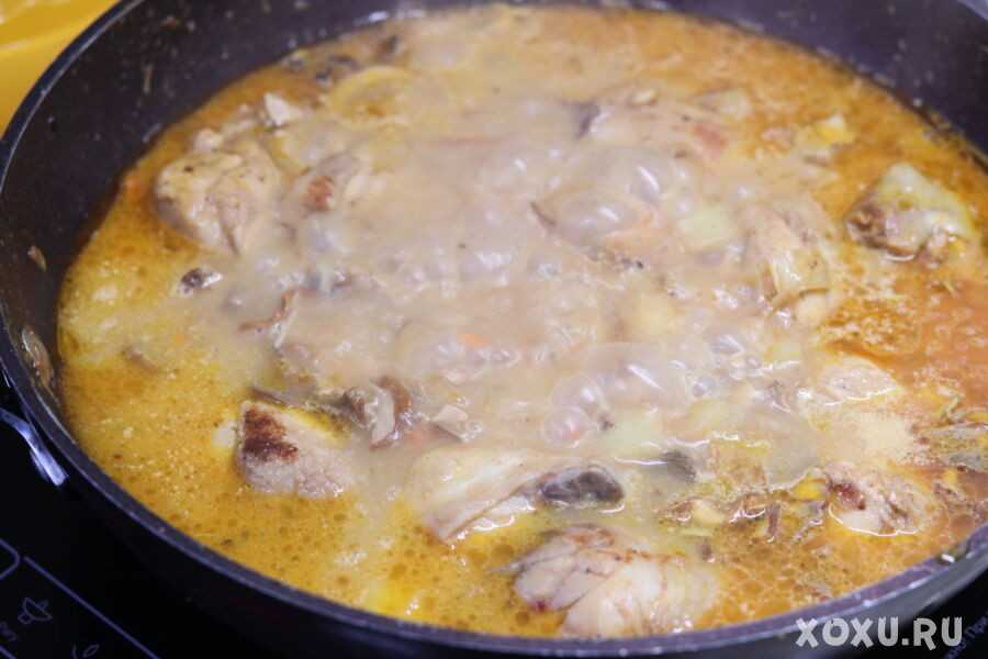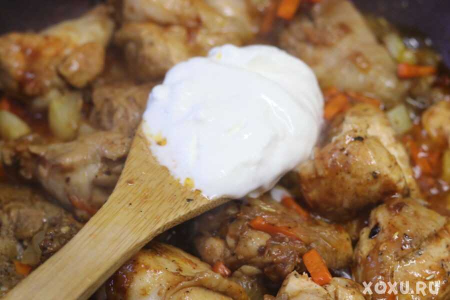 Как же вкусно получается. Ммм… Пальчики оближешь! Нежная обжаренная курочка томится, да ещё с добавлением сметанки. Ух…