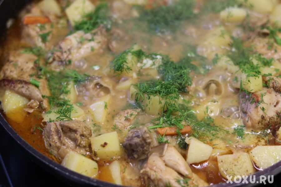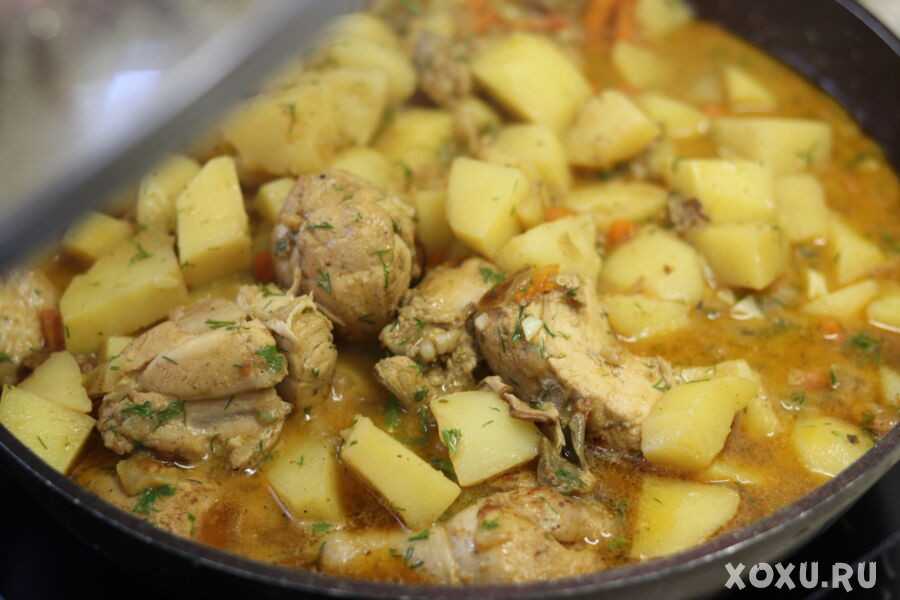 Первый шаг процесса – предварительная подготовка продуктов. Мясо следует промыть, обсушить. Затем оно нарезается мелкими либо средними кусочками. Картофель и остальные ингредиенты, которые могут использоваться (морковка, томаты, лук, чеснок и другие продукты) чистятся, моются, измельчаются. Сначала обжаривается курятина, затем к ней добавляются овощи. Все это заливают определенным количеством воды или бульона, приправляется и томится на плите, в духовке или специальном кухонном приборе.