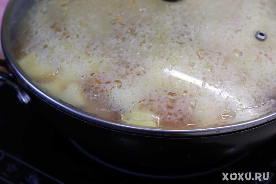 - Дождитесь запекания, убавьте огонь до минимума и готовьте под крышкой порядка четверти часа.