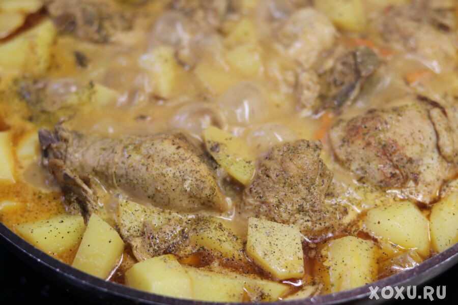 Шаг 11. Спустя полчаса проверяем на готовность картофель. Заодно на соль и перец. При необходимости перчим…
