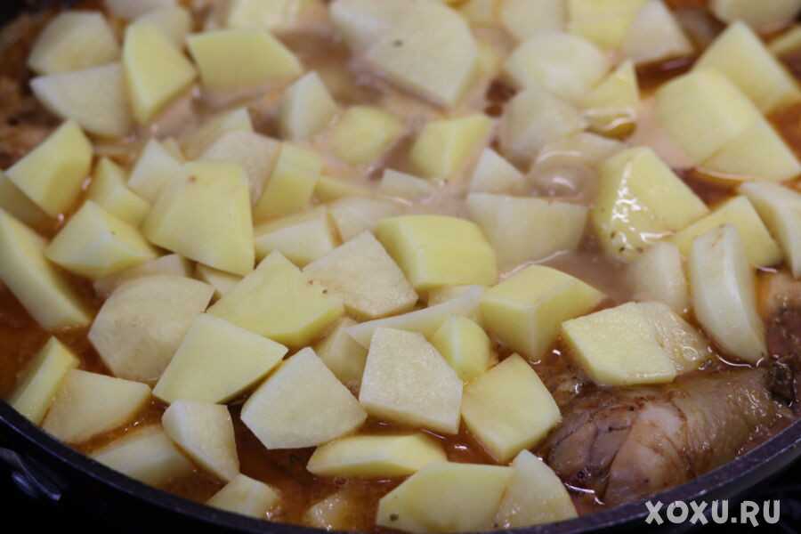 Ну вот и всё, друзья мои. Отправляем следом картофель. Здесь всё просто. Кубики средней величины, ведь от размера зависит время готовности