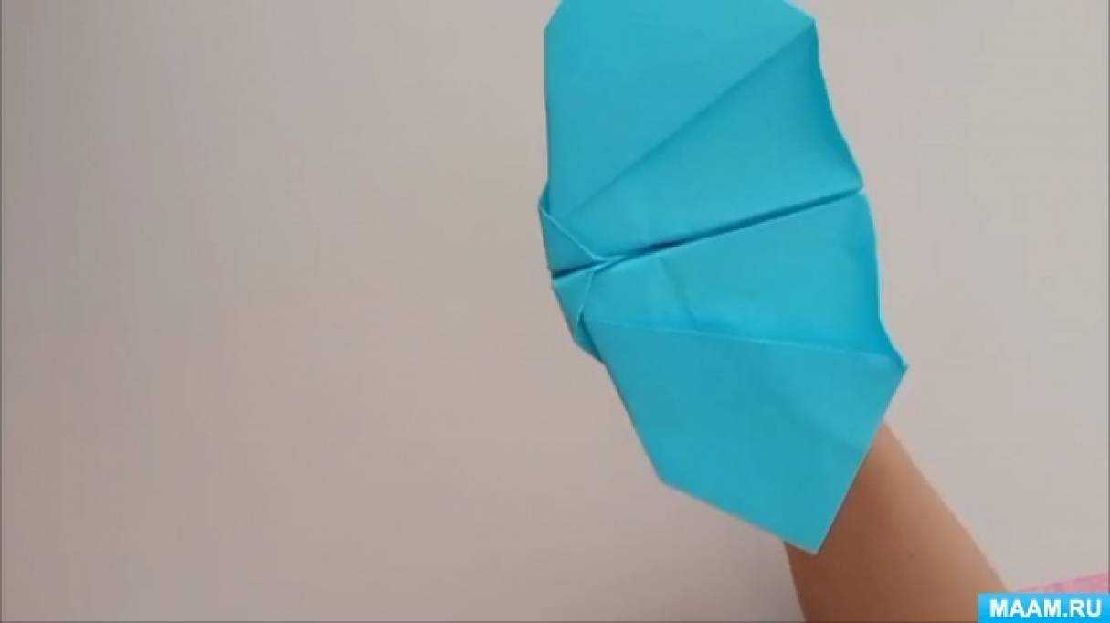 7. На последнем этапе согните полученное изделие по центральной линии — треугольная часть будет видна снаружи. Стороны отогните к центру. Всё — самолет готов