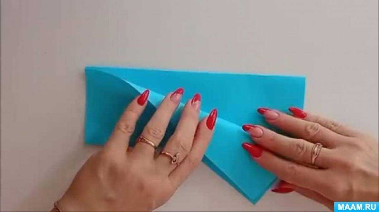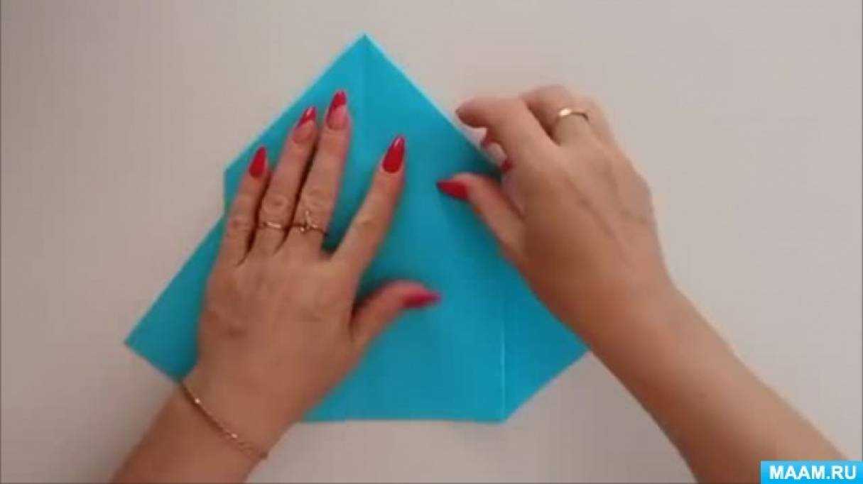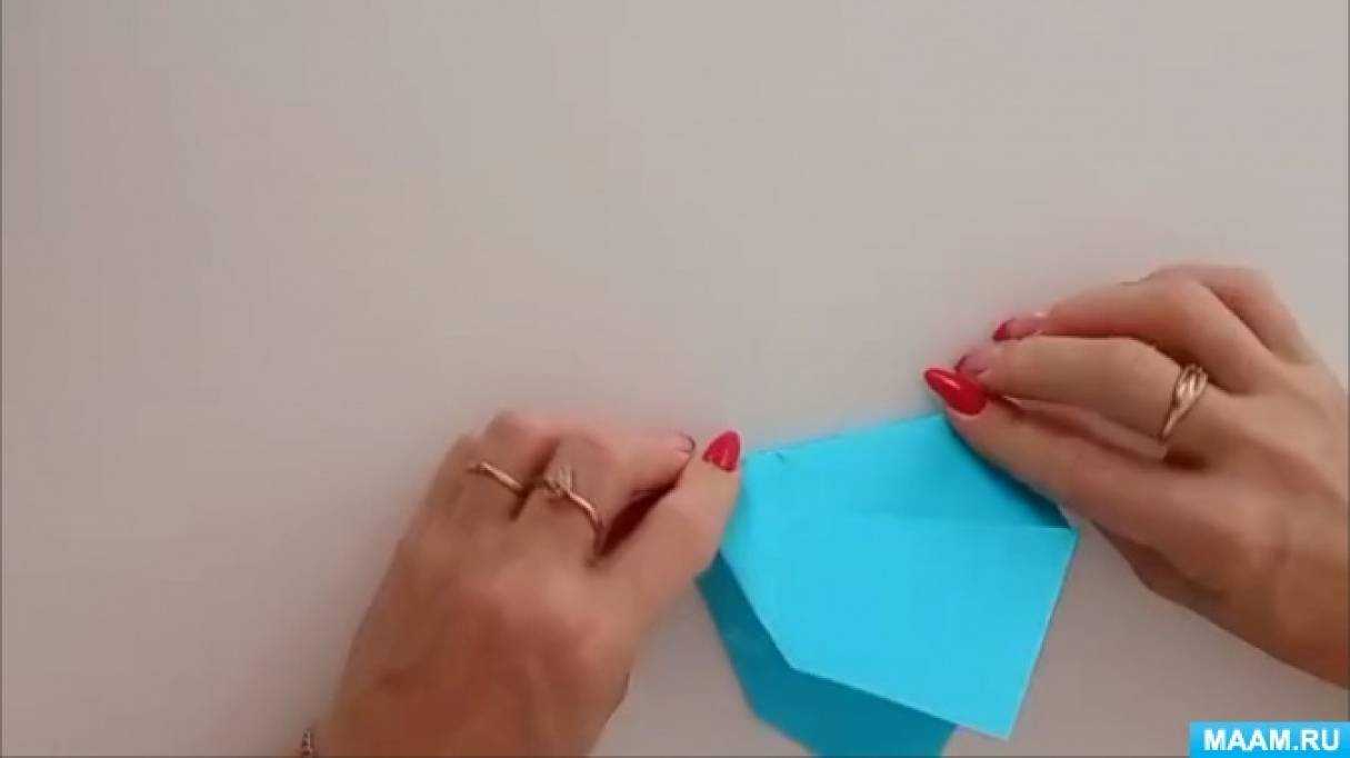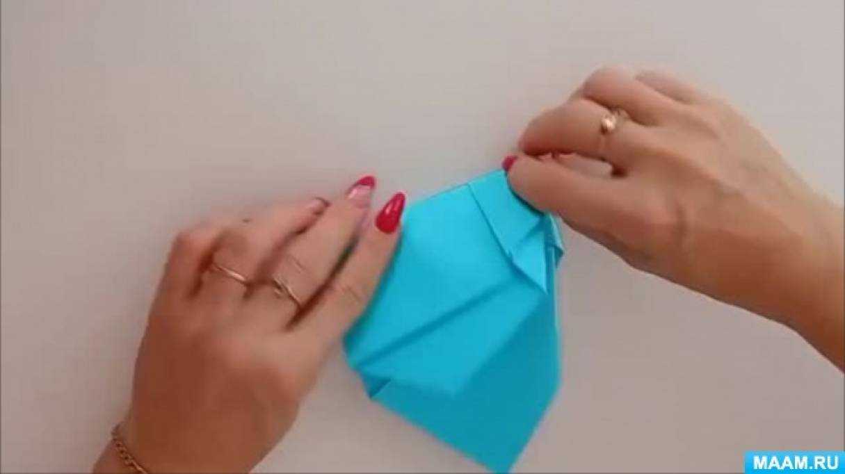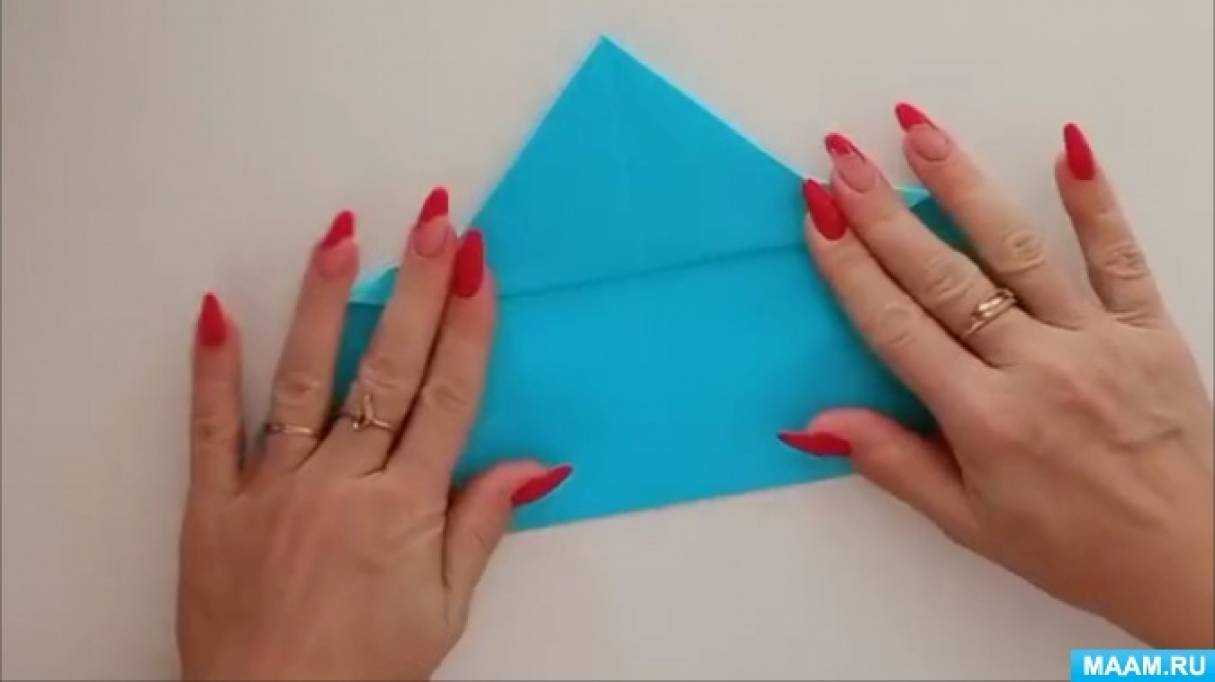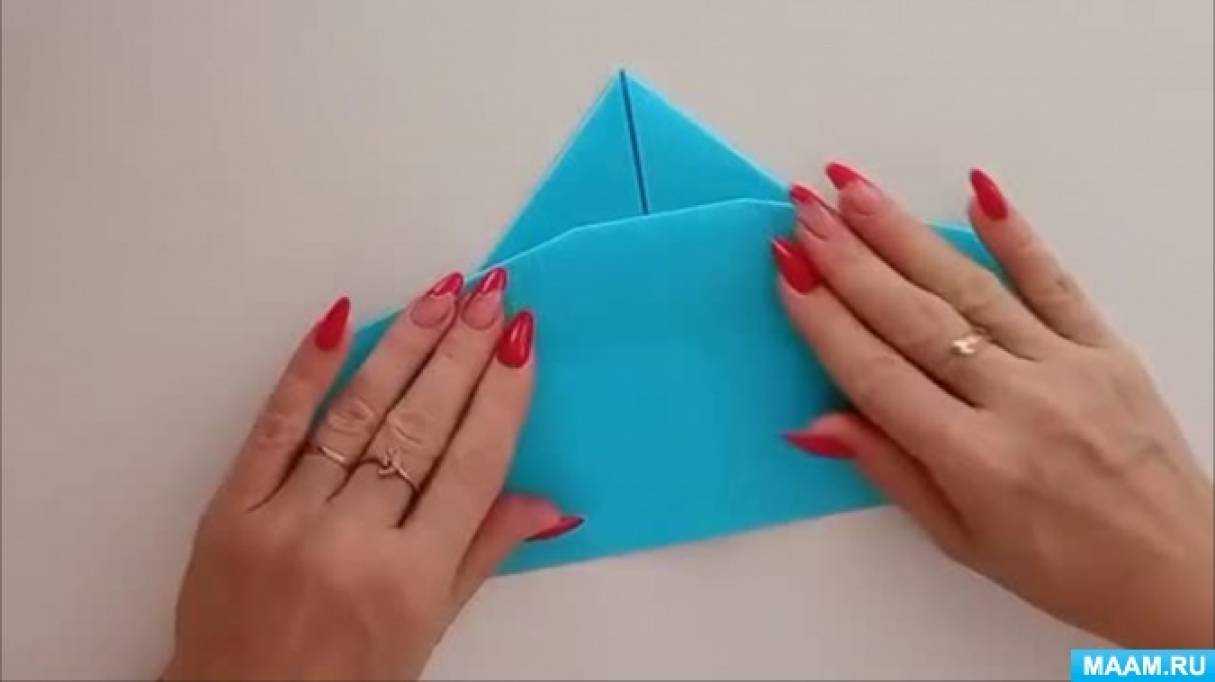 - Фигуру сложить по линии сгиба. Уголок треугольника прогнуть внутрь. Фигурку перевернуть, сложить вдвое, прогибая только центр.