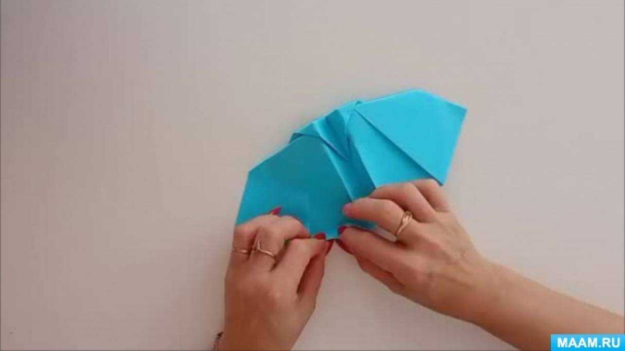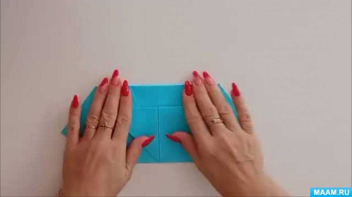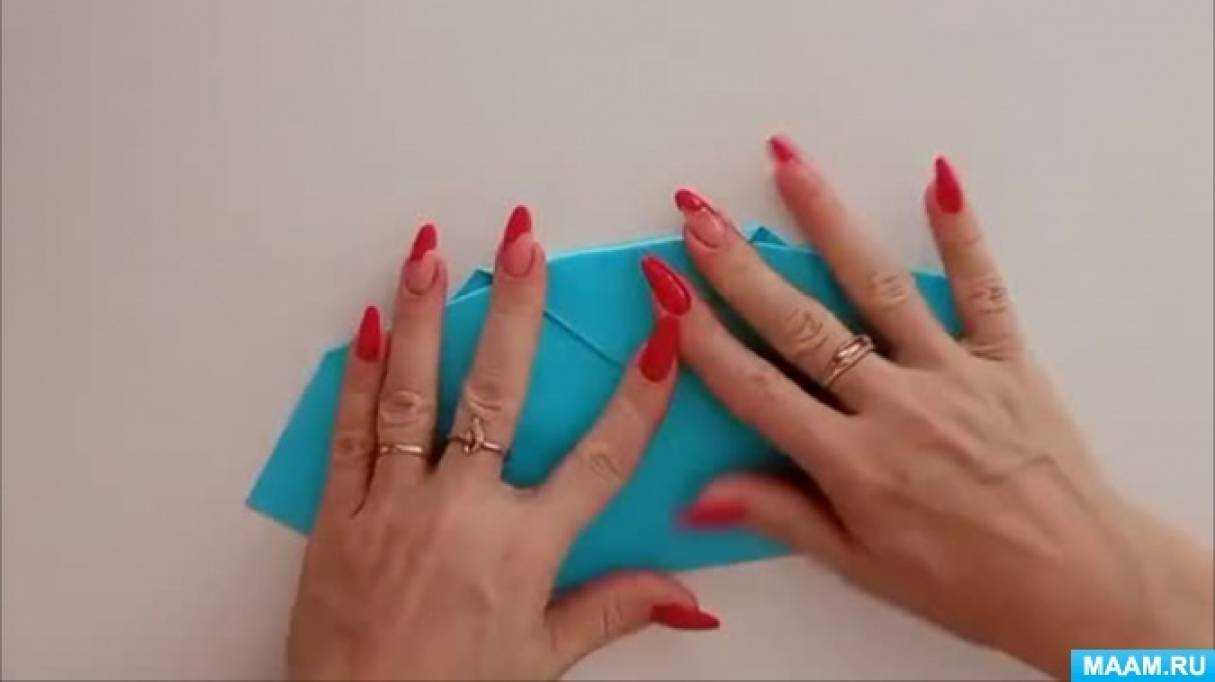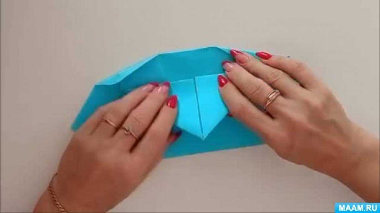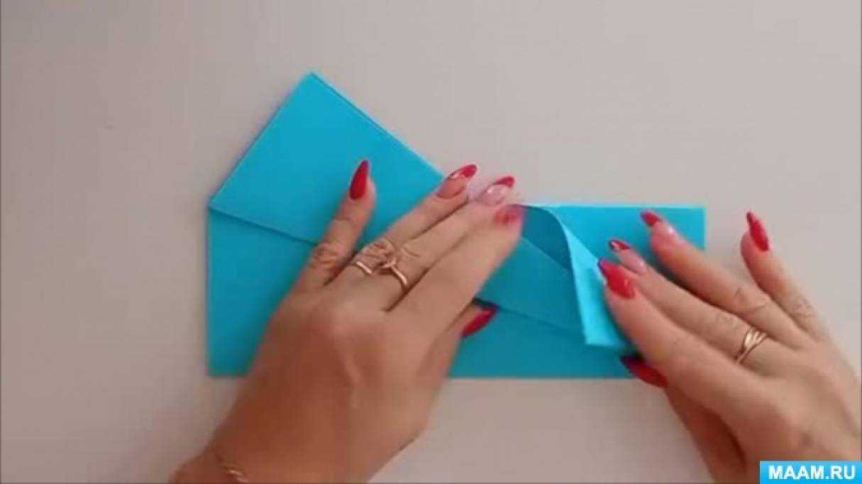 - Посередине расположен вытянутый пятиугольник. Заверните два нижних уголка к центру. Раскройте. Получившиеся два маленьких треугольника вдавите внутрь. Переверните поделку.