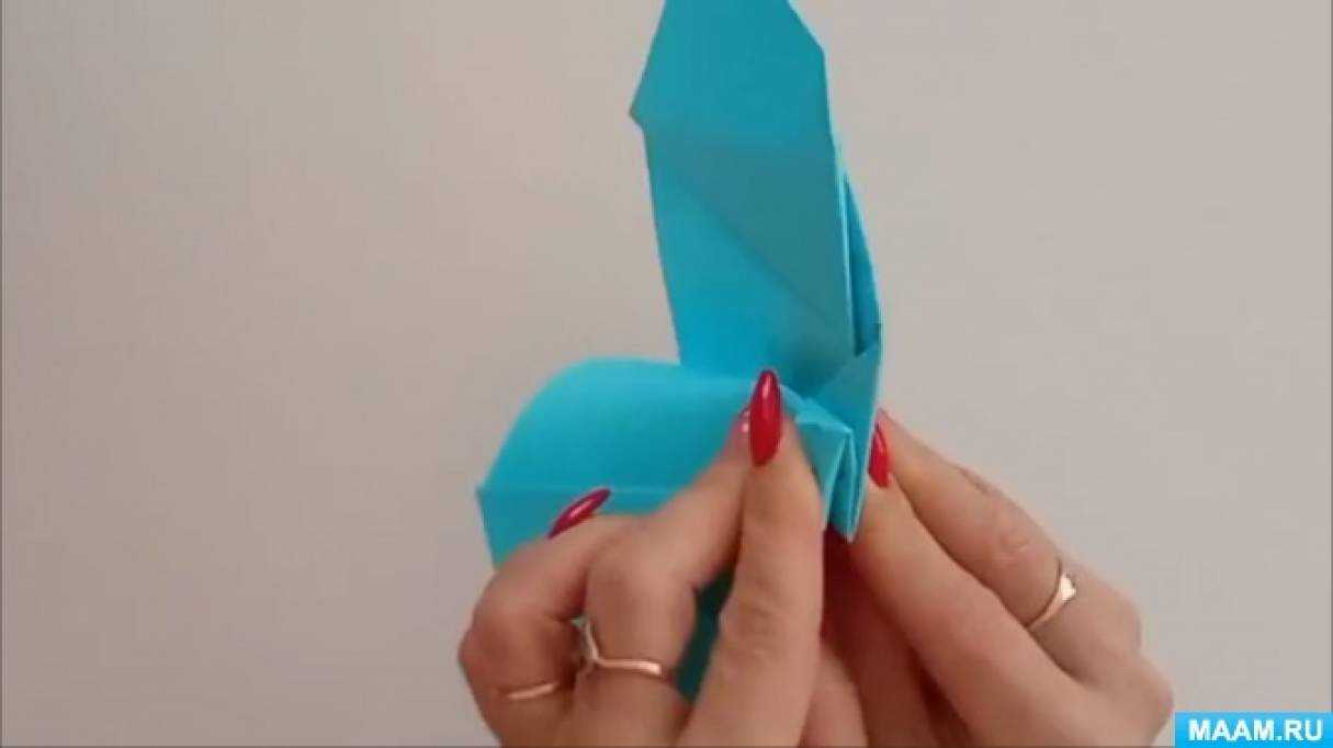 - Перевернуть поделку, согнуть крылья к центру и сформировать туловище. Мышка с подвижными конечностями готова.