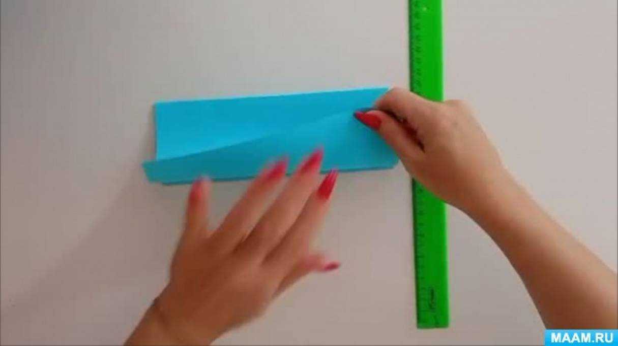 Далее самолёт нужно развернуть и согнуть его переднюю часть вверх, чтобы нос коснулся прямой линии края листа.