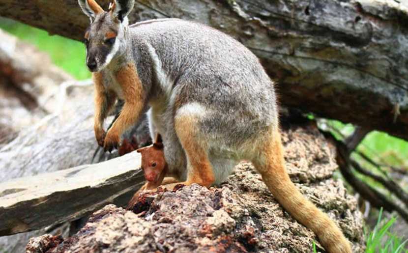 Кольцехвостый кенгуру или по другому Желтоногий скальный валлаби или желтоногий кенгуру, млекопитающие из семейства кенгуровых. Этот вид кенгуру предпочитает селится в скальных районах, избегая других животных и человека.