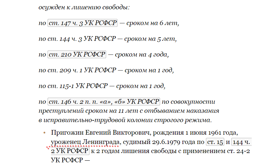 После окончания школы в 1977 году, Евгений Пригожин вскоре столкнулся с первой судимостью. В 1979 году его приговорили к условному сроку за кражу. Однако это не остановило будущего лидера «вагнеровцев», и через два года он получил серьезный приговор. В 1981 году суд приговорил его к 13 годам заключения в колонии усиленного режима по нескольким статьям, включая «кражу», «разбой», «мошенничество», «вовлечение несовершеннолетнего в преступную деятельность», «попрошайничество» и «азартные игры».