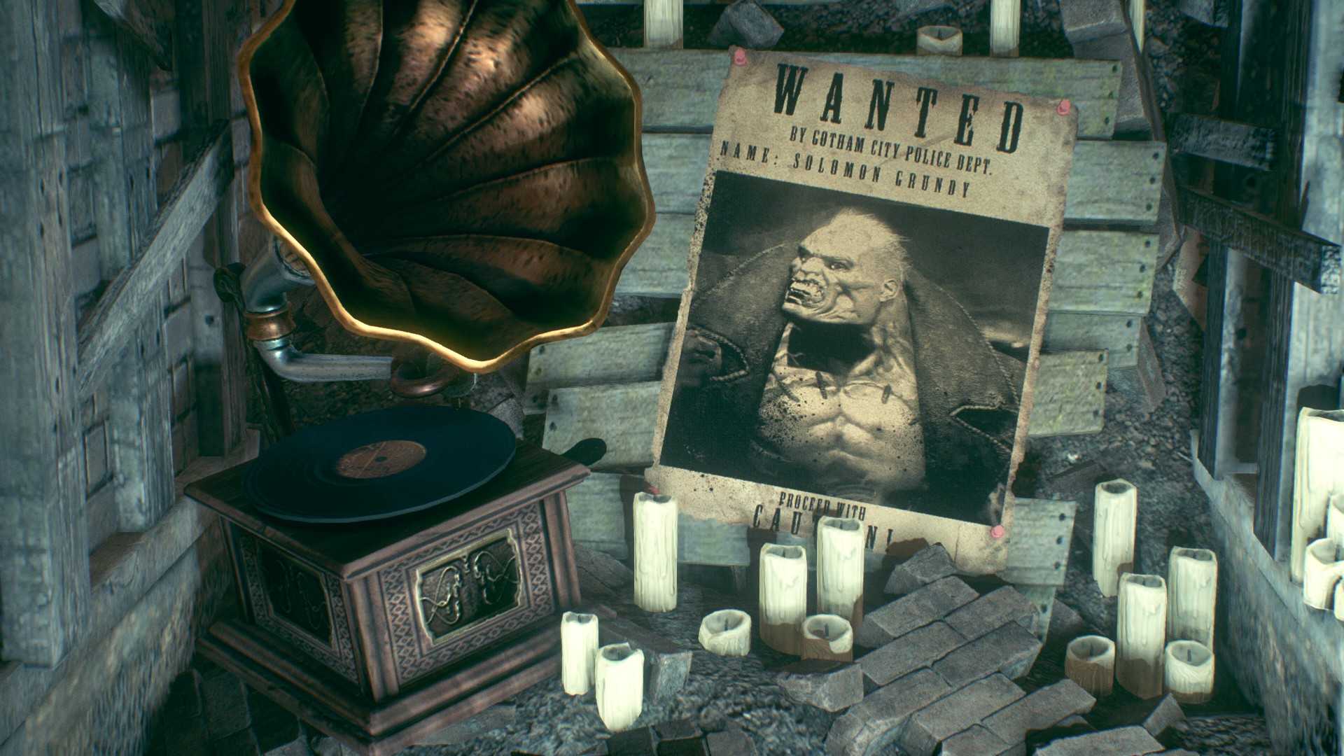 Граммофон и плакат с Соломоном Гранди в помещении, за чёрным забором. (2202,1827°)
