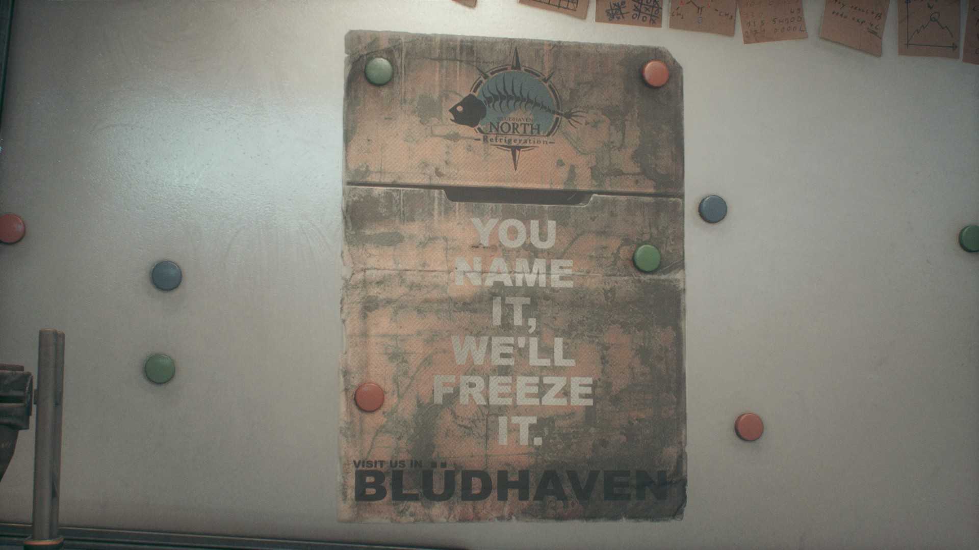 Плакат “North Refrigeration” рядом с устройством стабилизации, справа от входа на дальнем дирижабле. (Внутри – 2090,1238°)