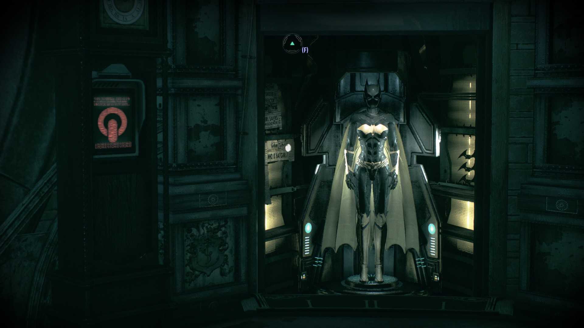 Костюм Барбары Гордон в часовой башне, за взламываемой панелью. (Внутри – 2095,2260°)