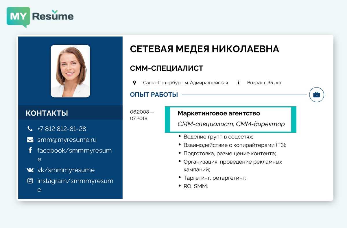 Не нужно надеяться, что название должности составит у рекрутера точное представление о вашем предыдущем месте работы. Поэтому формулировка «инженер» или «менеджер» не принесет желаемого результата, а именно, оказаться на более высокой должности. Здесь требуется писать так: «менеджер по продажам», «инженер энергетик».