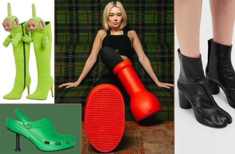 В разряд «бархатных тяг» попали и дизайнерские творения последних лет: красные ботинки от MSCHF, сапоги с телепузиком Дипси от Christian Cowan, кроксы на шпильке от Balenciaga и даже культовая обувь с раздвоенным носом от Maison Margiela, впервые появившаяся еще в 1989 году.