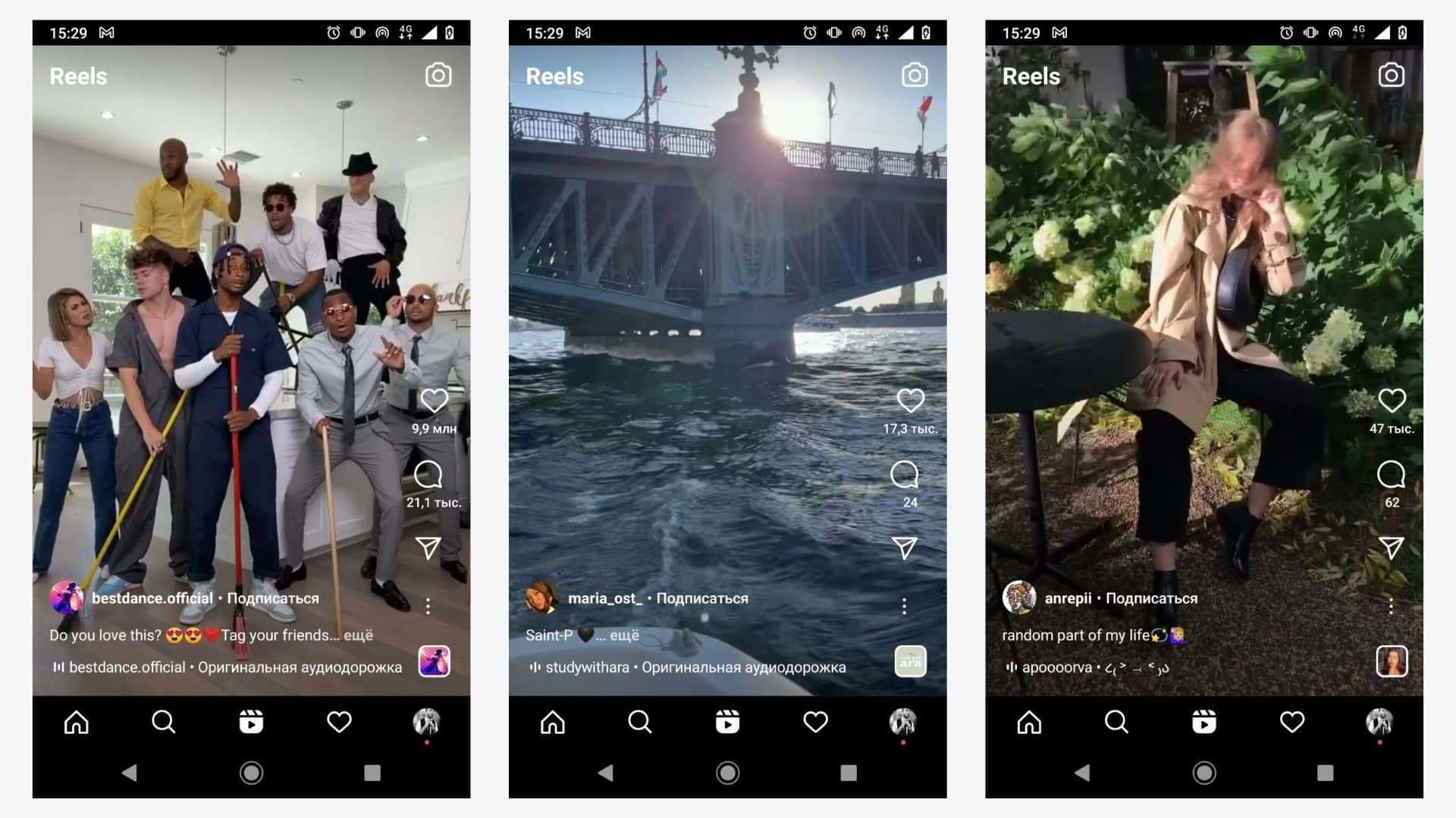 Инстаграм* старается показывать в Reels как сверхпопулярные ролики, так и работы небольших авторов. Вот первые три скрина из моей ленты – количество лайков и комментариев везде разное
