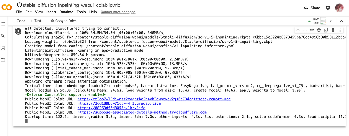 Выберите версию 1.5 или 2.1, справа на странице нажмите «Подключиться», затем «Среда выполнения» — «Выполнить все». После этого начнется скачивание моделей — это занимает 5-10 минут. Когда оно завершится, пролистайте страницу с кодом до конца и нажмите на любую из ссылок.