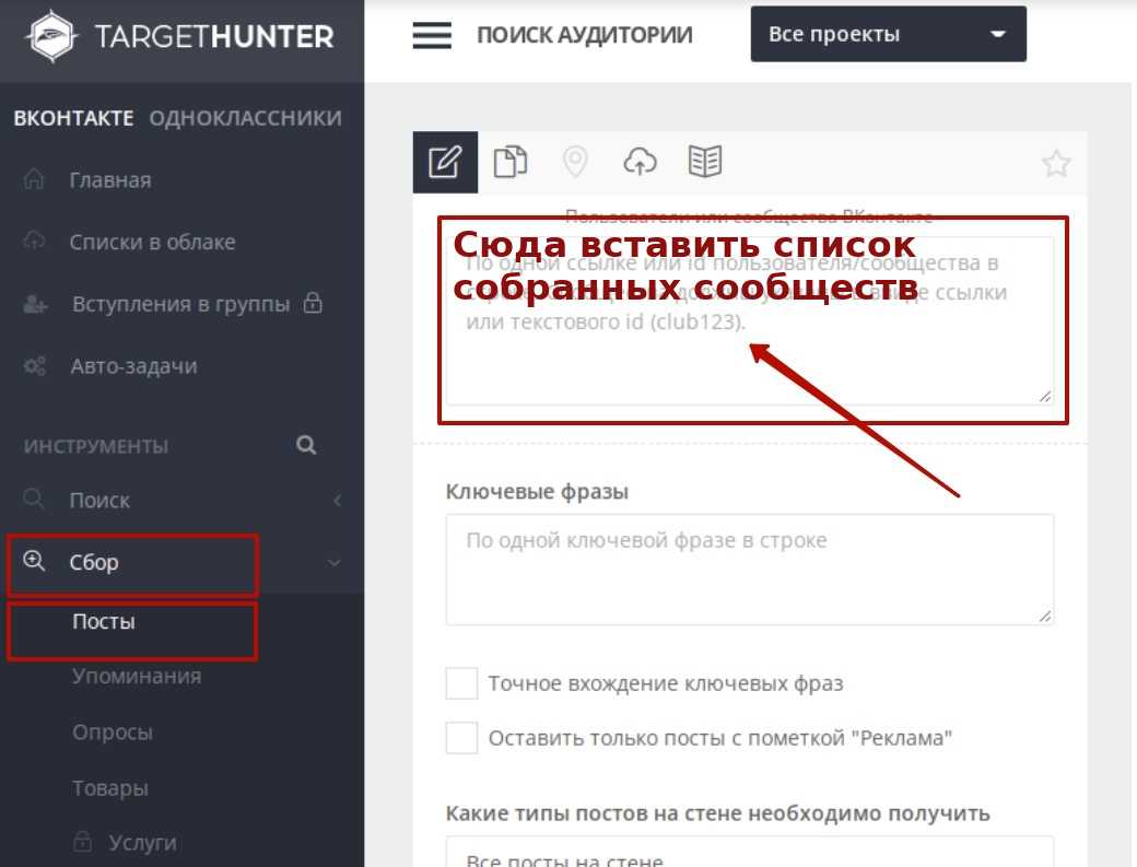 Чтобы найти актуальные темы, которые подписчики охотно будут обсуждать, — анализируйте проблемы ЦА, связанные с вашим продуктом. Можно сделать с помощью TargetHunter — Сбор > Посты. Найти в тематических сообществах вашей ниши посты за определённый срок.