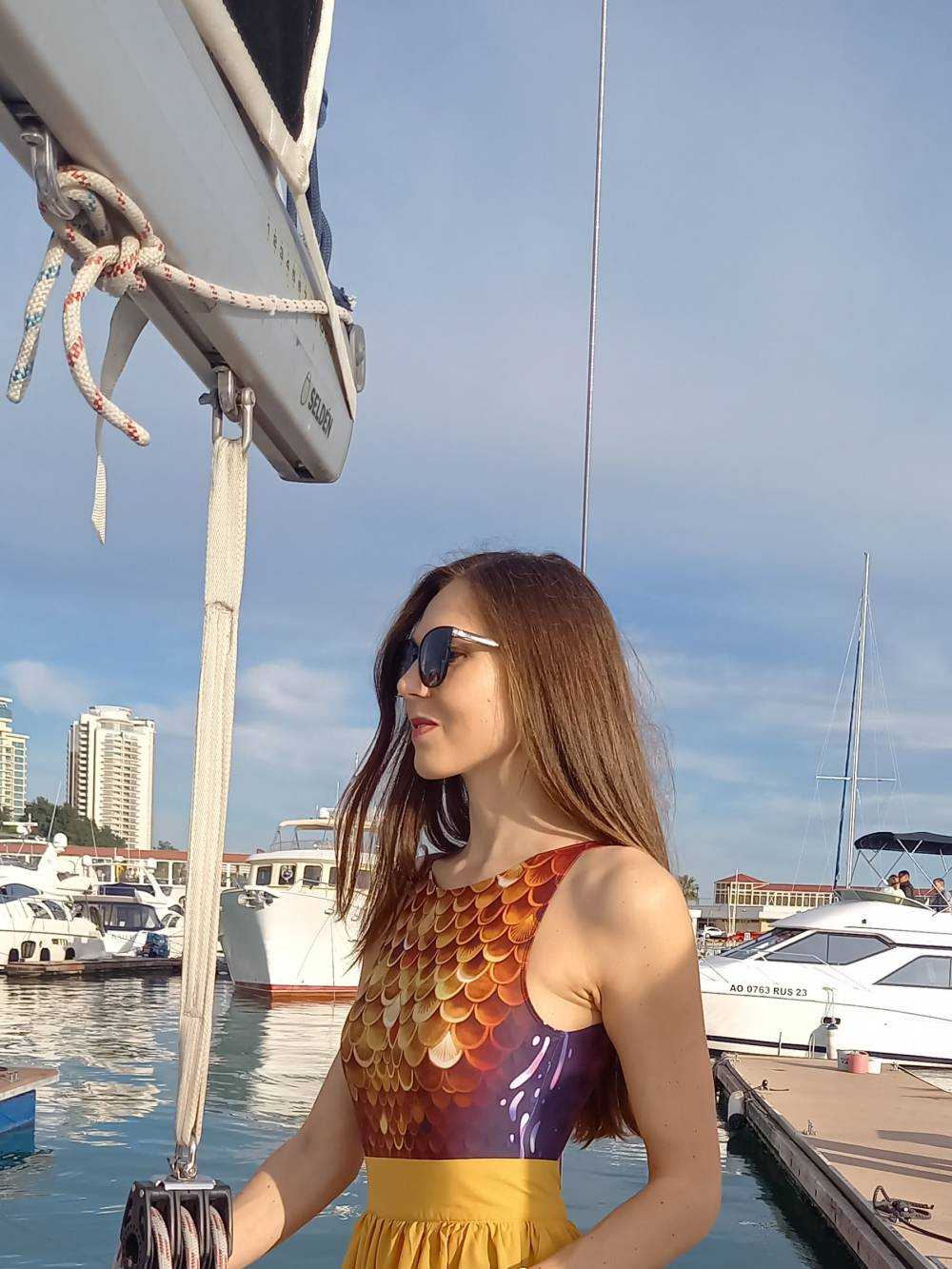 В конкурсе было много уже семейных девушек, и на голосовании было принято решение — не делать выход в купальниках, но для тех, кто хотел продемонстрировать свою красоту была фотосессия на яхте, где каждая сама выбирала свой наряд. На съемку можно было взять свою одежду или взять в аренду у сочинского дизайнера (для участниц бесплатно). Я была в образе «Золотой рыбки» — купальник и юбку мне подобрала Полина Польски (дизайнер). Кстати, именно это знакомство потом привело меня на съёмку для итальянского журнала.