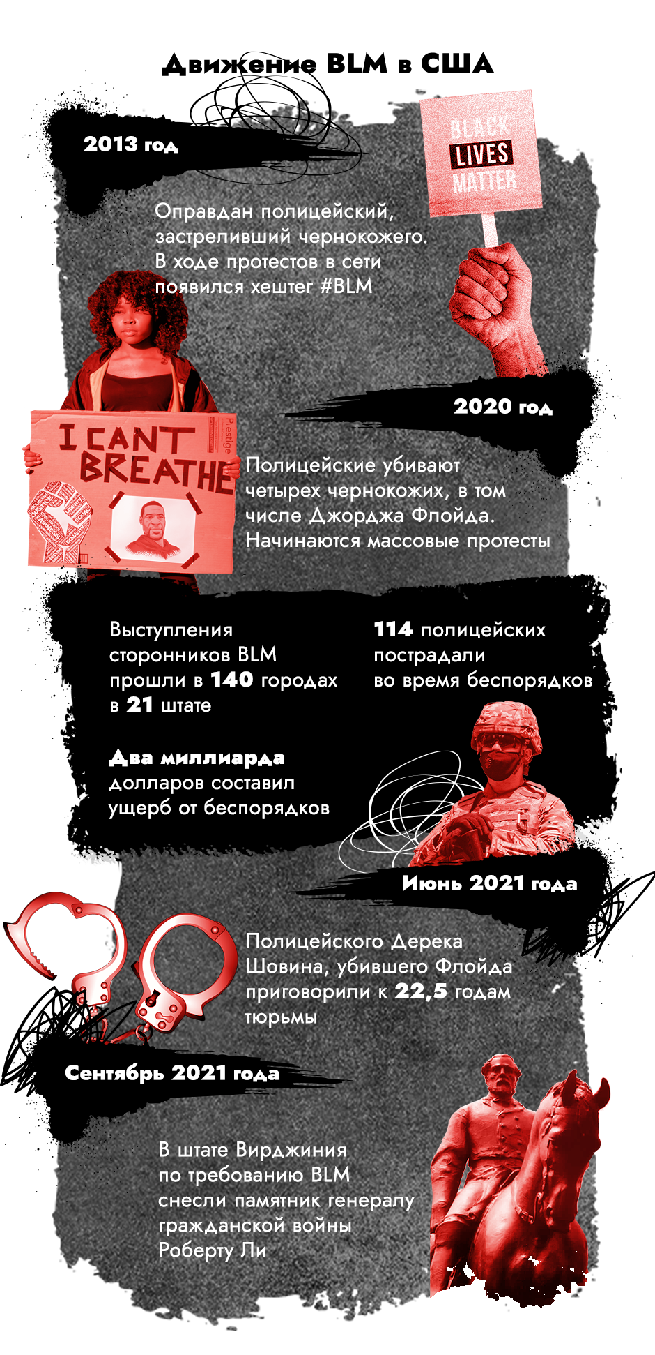 Но активисты BLM все же уверены, что государственная система — не на их стороне. Главным доказательством этого они считают отношения с полицией: гибель Джорджа Флойда при задержании и ряд других громких смертей стали символами полицейского беспредела в отношении чернокожих.
