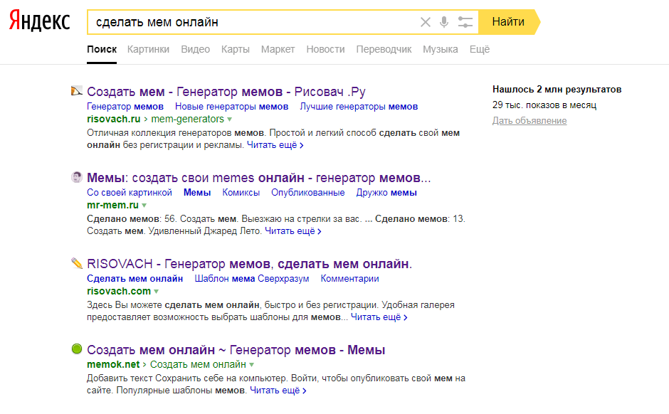 Здесь же скажем, что в интернете полно ресурсов позволяющих сделать мемы в онлайн режиме. Достаточно вбить в Яндексе фразу «сделать мем онлайн» и Вам будут предложены десятки хороших сервисов.