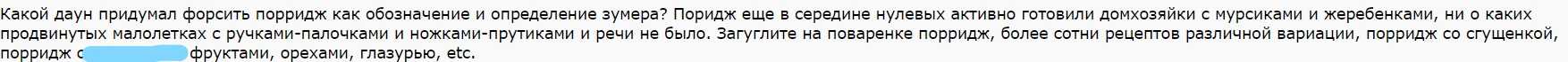 Тем временем часть анонимов выступила против против употребления слова «поридж» в отношении молодых людей. Так, один из пользователей «Двача» привёл аргумент: пориджем в кулинарных блогах давно называют овсянку, а значит, тренд не имеет смысла.