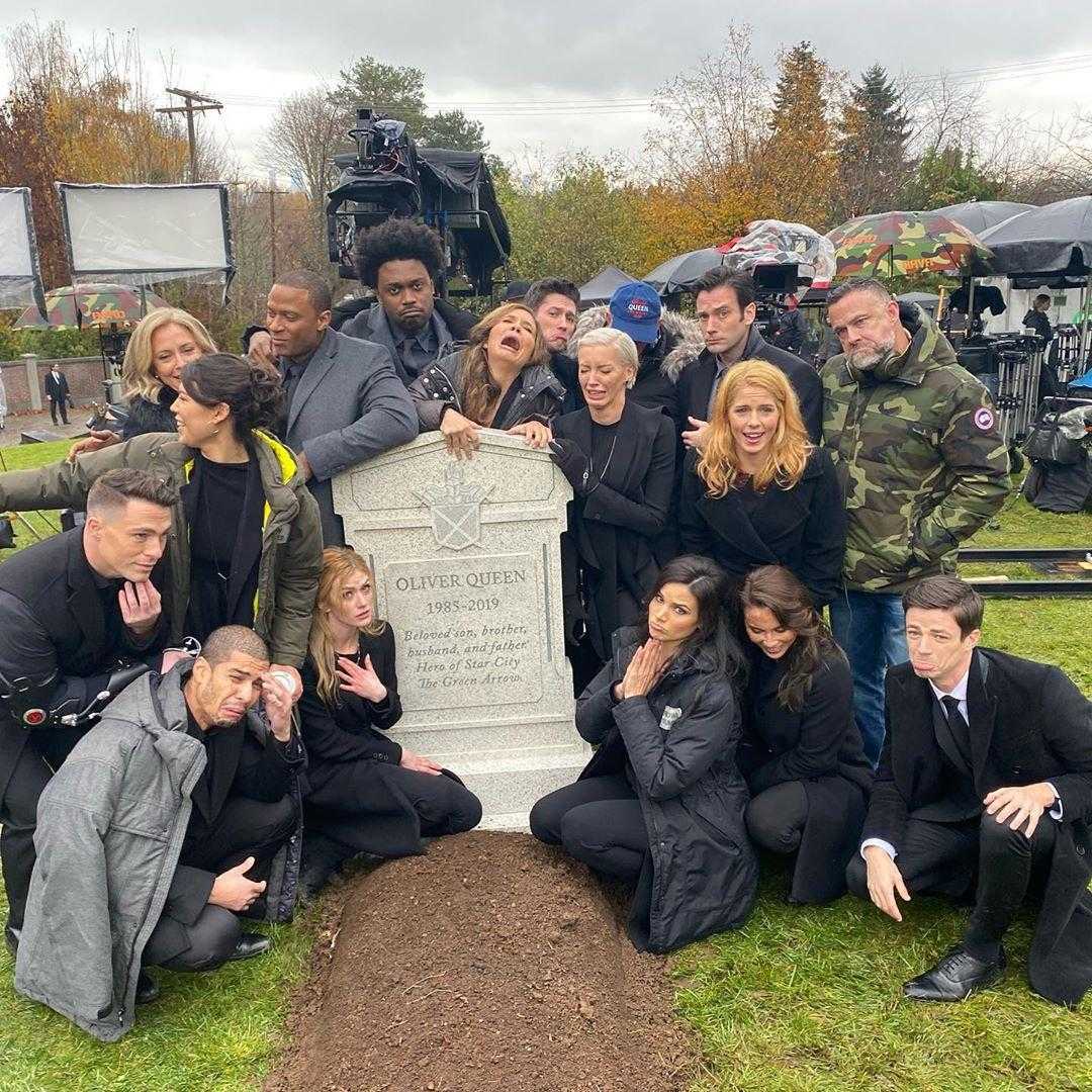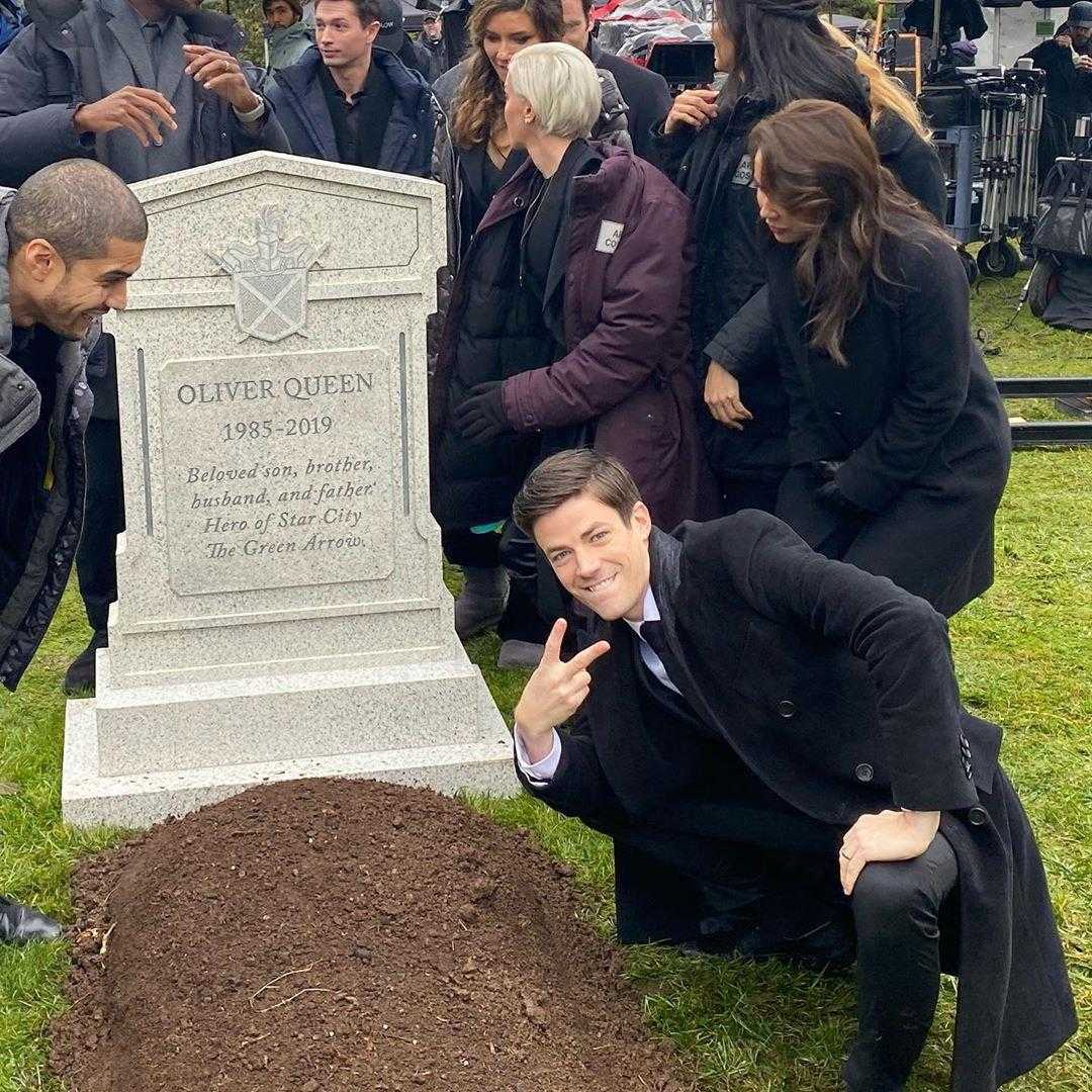В последнем эпизоде стало известно, что супергерой Стрела (Оливер Куин) погибает. По этому случаю актерский состав сделал шуточное фото у могилы персонажа. Среди них есть и кадр с Грантом Гастином, который исполняет роль Флеша.