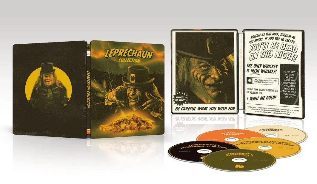 Фильмы о лепреконах стали культовой классикой среди фильмов ужасов. Эти фильмы не приносили больших кассовых сборов, но имели такие маленькие бюджеты, что приносили прибыль. Эти фильмы впоследствии стали возмутительными продолжениями, в том числе « Лепрекон в капюшоне» и « Лепрекон в космосе» . Он был наиболее известен тем, что Уорвик Дэвис изображение главного злодея ужасов Лепрекона. В этот набор входят версии всех фильмов с рейтингом R. Он стоит 49.99 долларов. Это обязательно для поклонников этих сумасшедших фильмов ужасов.