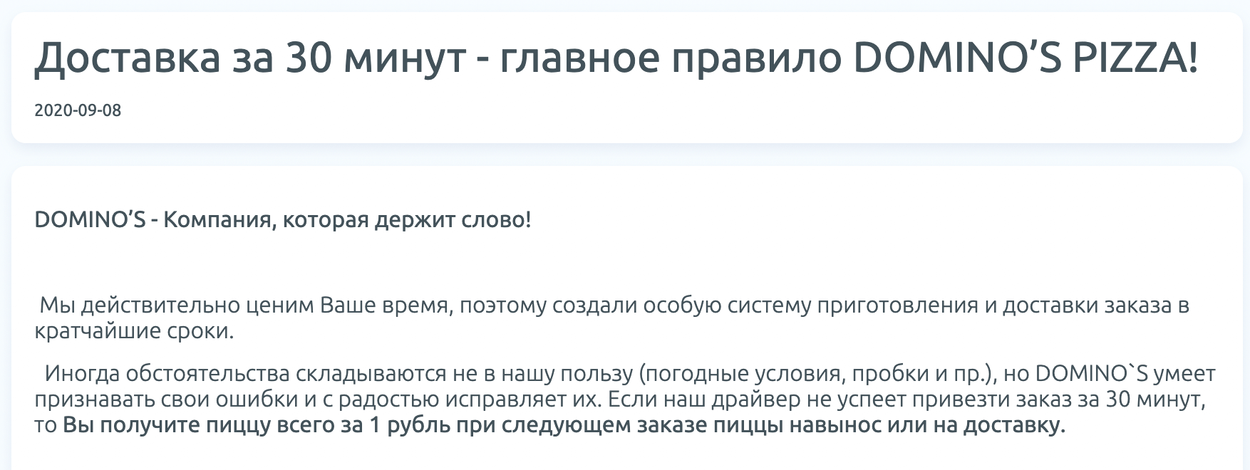 Интересный факт: в США такую формулировку компания перестала использовать с 1990-х годов. Но УТП было настолько запоминающимся, что даже в 2017 году курьеры делились на Reddit историями о клиентах, которые ожидали бесплатную пиццу при малейшем опоздании.