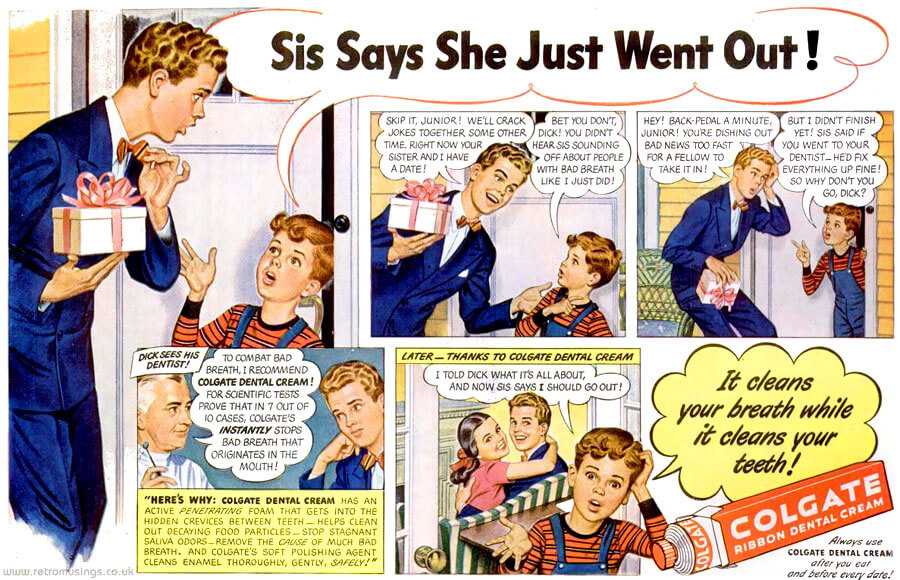 Реклама Colgate 1948 года: компания выпустила серию комиксов с УТП «Освежает дыхание, пока вы чистите зубы». Источник