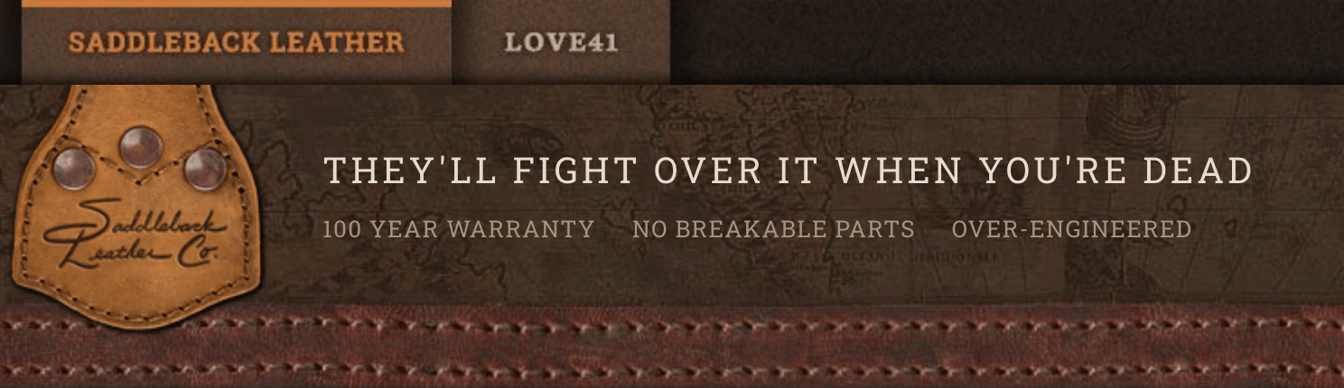 В уникальном торговом предложении Saddleback leather — которое здесь удачно совмещается со слоганом — отражено важное преимущество продуктов компании: долговечность. Многие изделия люксового сегмента позиционируют через статусность и стильность, поэтому упор на долговечность выделяет Saddleback среди конкурентов
