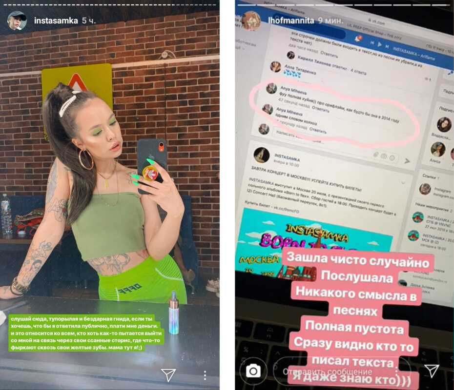Кроме того, Хофманита не очень хорошо относится к другой хайповой личности – Инстасамке (Дарья Зотеева). Когда Инстасамка тоже начала записывать рэп, Хофманита начала критиковать и высмеивать ее. Та не осталась в стороне и обрушила на соперницу много оскорблений. Услило конфликт и то, что обе девушки записываются на одной студии.