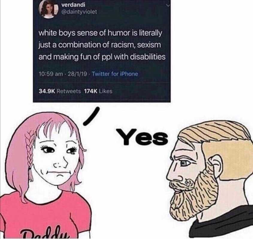 В сентябре 2019 года в западных и российских соцсетях завирусились мемы с бородатым мужчиной, который говорит “Да” группе непохожих на него людей. Эти люди задавали издевательские вопросы, касающиеся внешнего вида или убеждений оппонента.