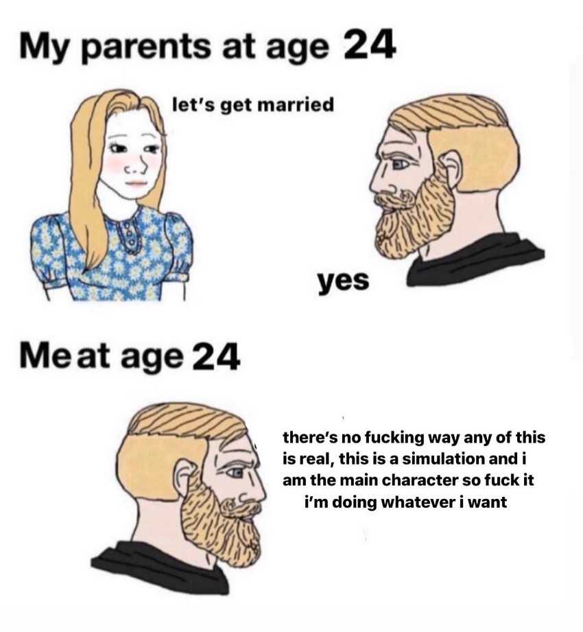 В то время как старшее поколение в меме в молодости планировало семью, современные юноши и девушки в меме задумываются о сути реальности.