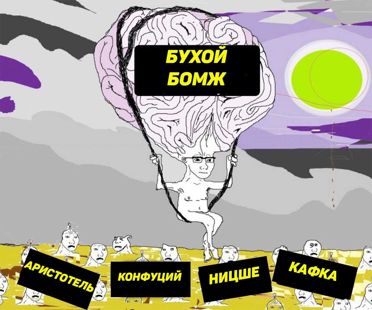 Супермозг — другой мем, который перекликается со «сверхразумом». На этой картинке изображен человечек, парящий на гигантском мозге как на воздушном шаре. Внизу в желто-корчиневом море видны люди с микроскопическими мозгами. Супермозг демонстрирует полное интеллектуальное превосходство над ними.