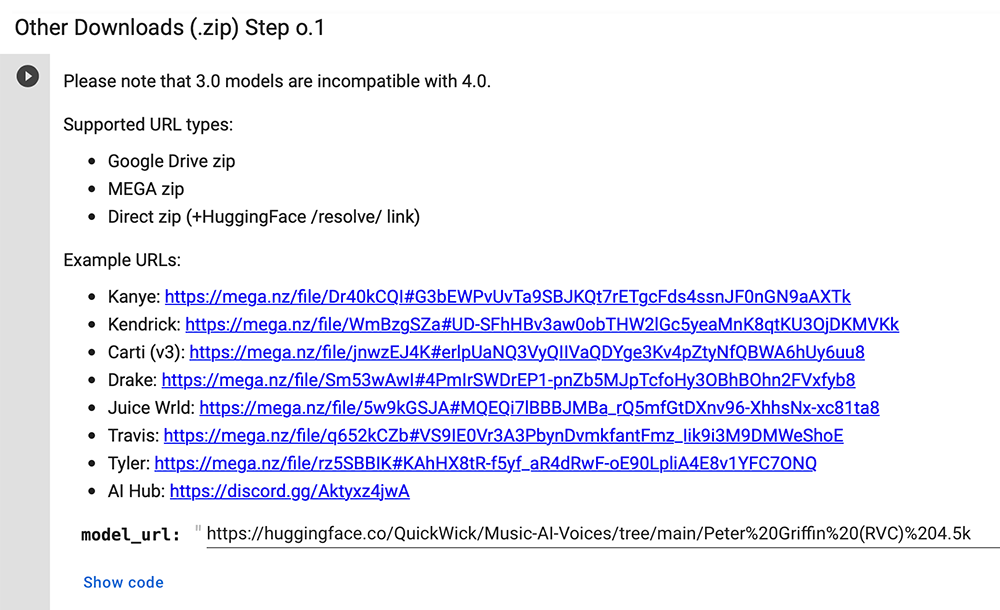 Шаг 7. Выберите голос, который будет исполнять вашу песню. Для этого под заголовком Other Downloads (.zip) Step o.1 найдите поле model_url и добавьте туда ссылку на папку с моделью голоса. Ссылки можно взять из списка предложенных в этой же ячейке: Канье Вест, Кендрик Ламар, Дрейк.