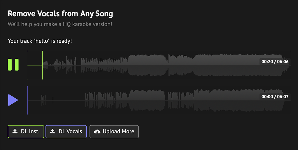 Шаг 2. Разделите трек на а капеллу и минус. Для этого перейдите на сайт x-minus и загрузите туда mp3-файл. Скачайте полученные файлы. Зеленая дорожка — а капелла, синяя — минус. Переименуйте их, чтобы не запутаться.
