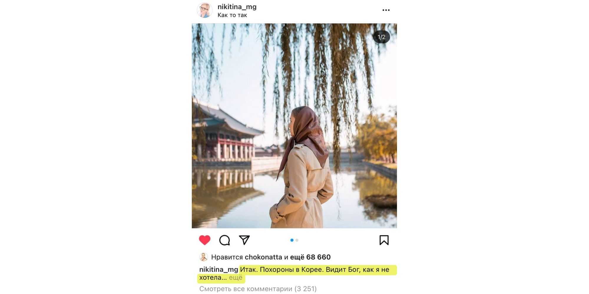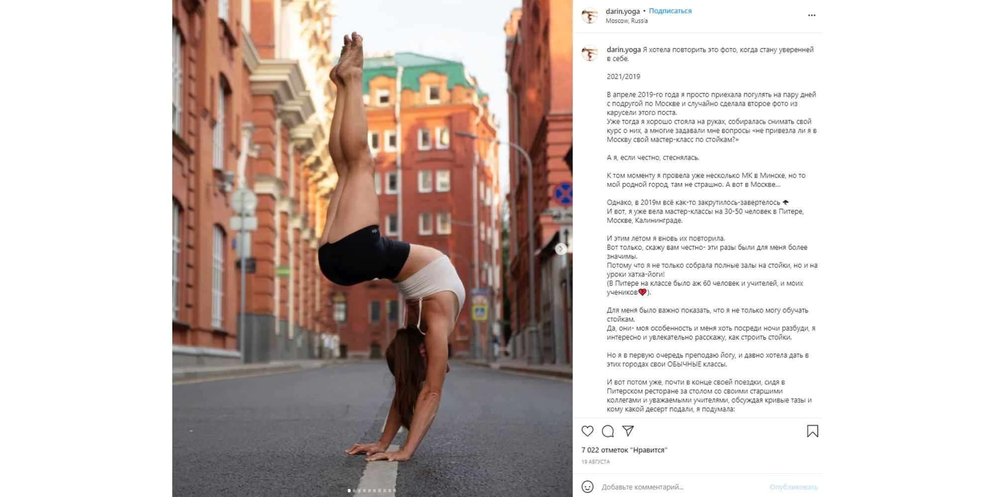 Пример Маргариты Распоповой: текст в формате рассказа о недавних размышлениях, визуал дополняет атмосферу нужными эмоциями